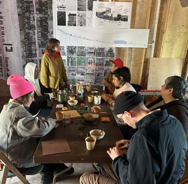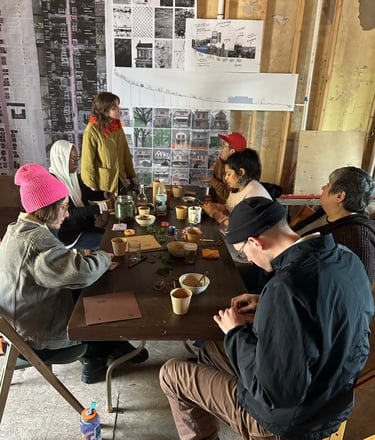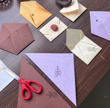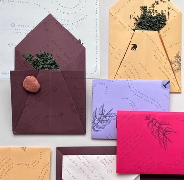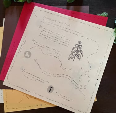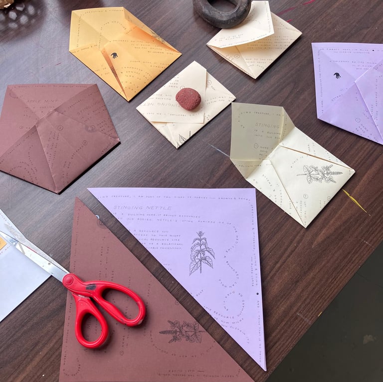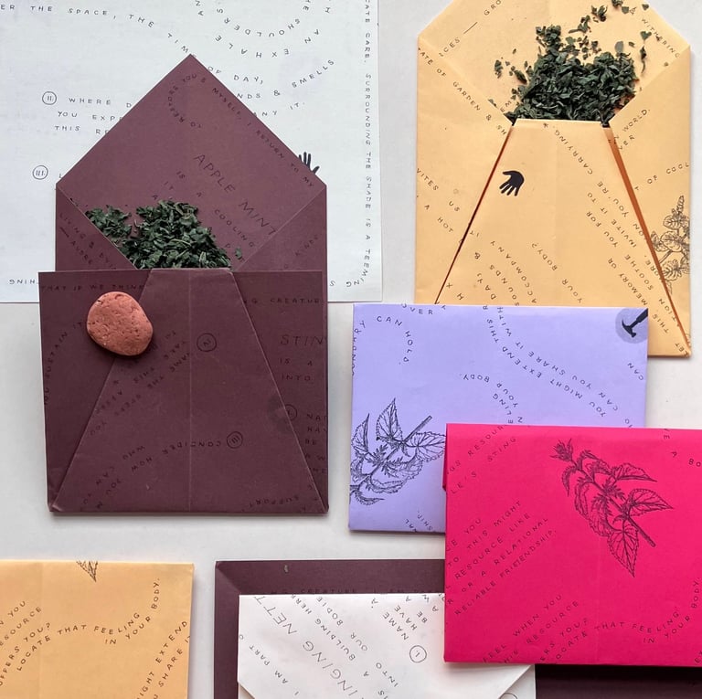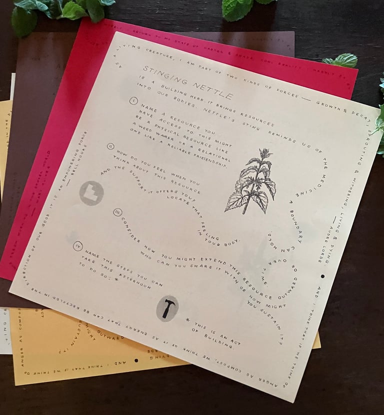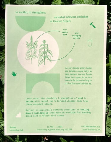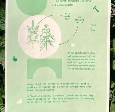 was held at General Sisters in North Braddock, PA. The workshop centered around apple mint and stinging nettle, two of the garden's most abundant herbs. Participants sipped tea and vinegar made from the plants as they learned about chemistry & energetics of apple mint and stinging nettle. Participants were led through a reflection guide inspired by the two herbs and their actions within the body. The guides were later folded into envelopes to allow participants to take the dried herbs with them.